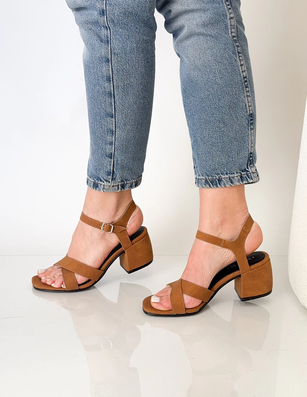 Sandalias de nobuck sintético con taco forrado en el mismo material.