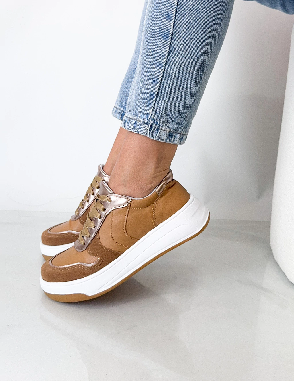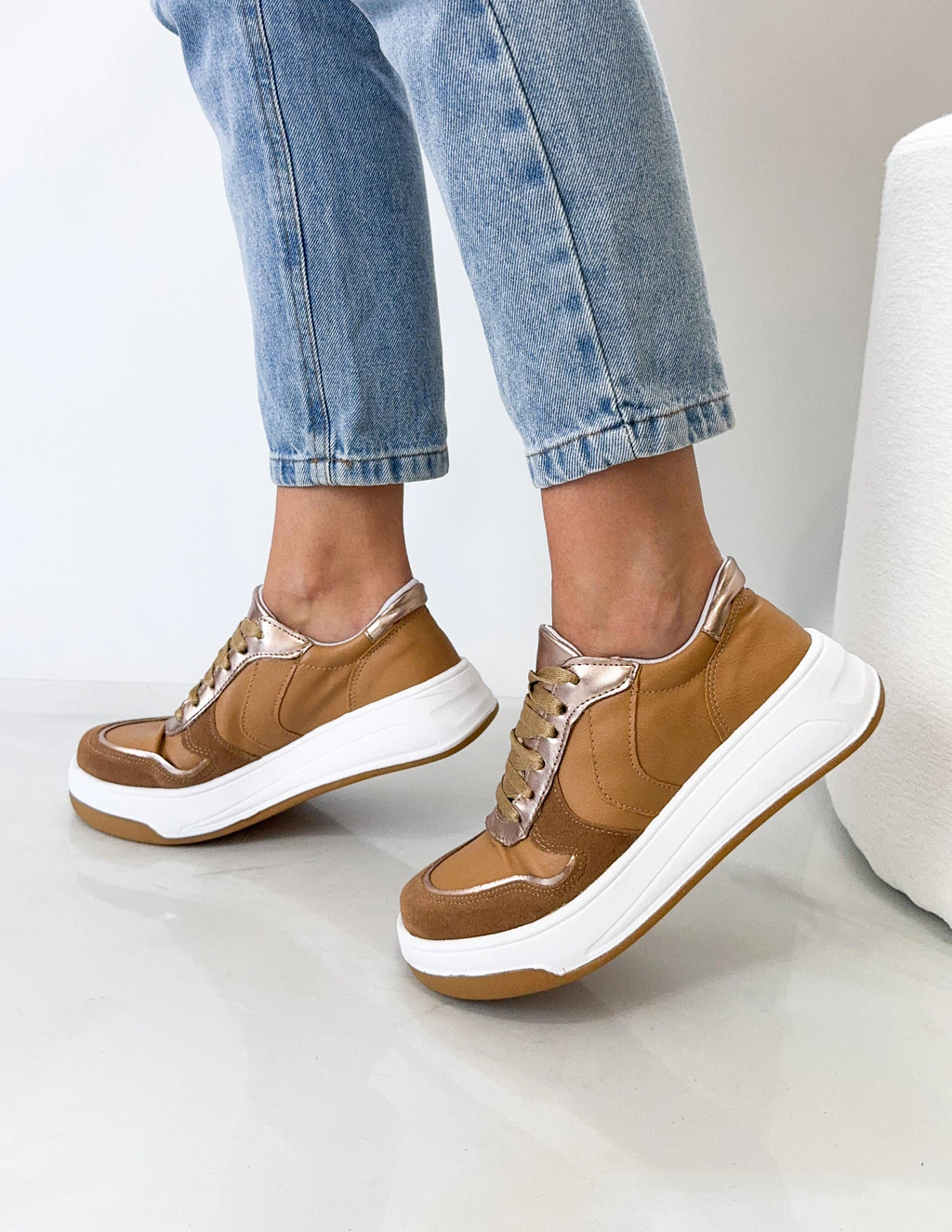Zapatilla de eco cuero con detalles en gamuza.